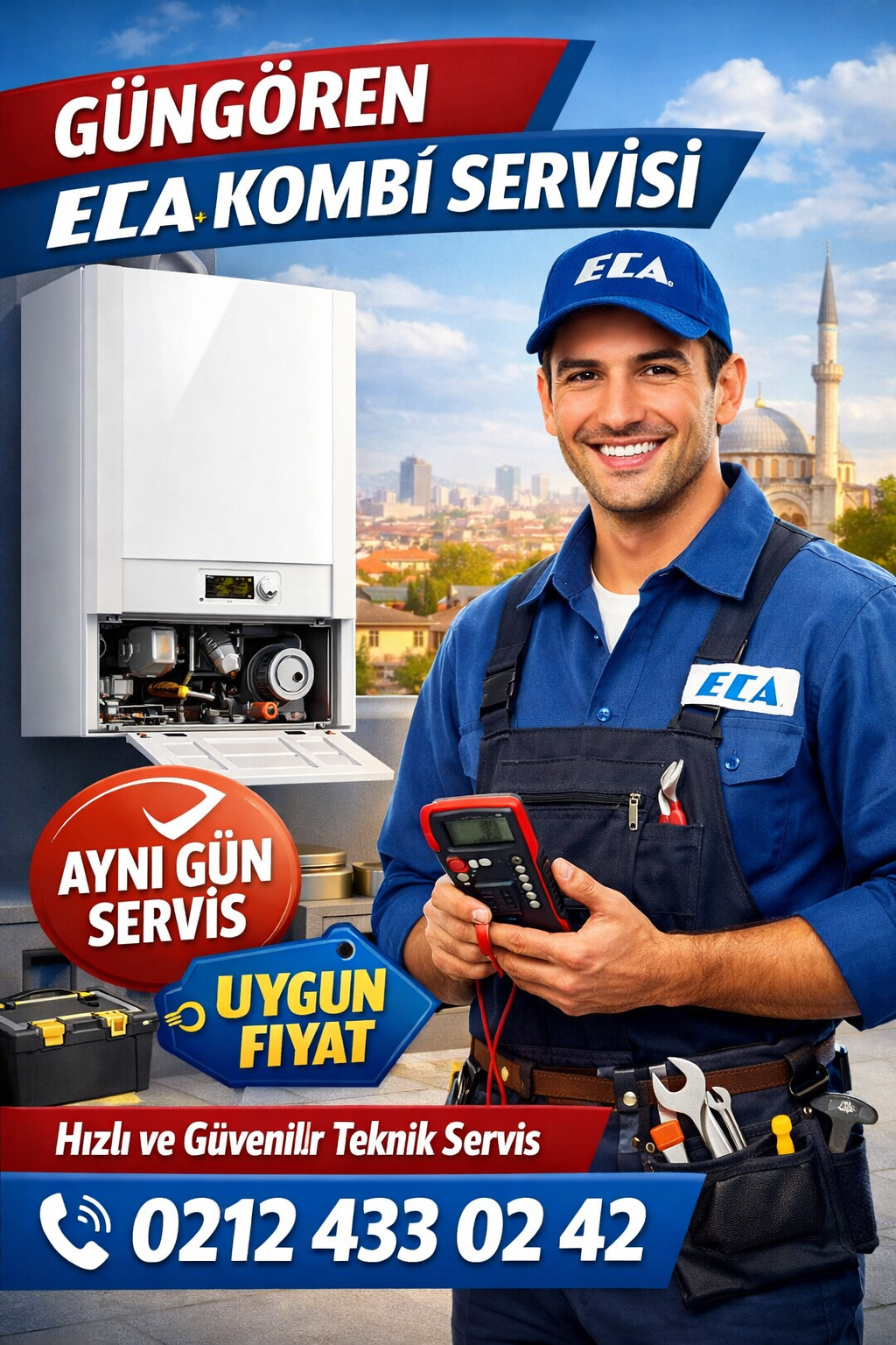 Güngören ECA Servisi olarak, ECA marka kombi, şofben ve diğer ısıtma sistemlerinizde oluşan tüm arıza, bakım ve montaj ihtiyaçlarına hızlı ve etkili çözümler sunuyoruz. Deneyimli teknik ekibimiz ile aynı gün servis imkânı sağlayarak, günlük yaşamınızı aksatan sorunları en kısa sürede gideriyoruz.